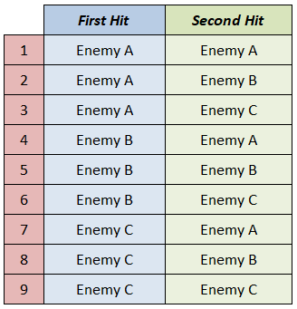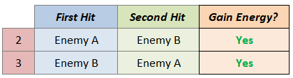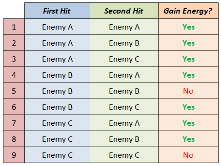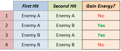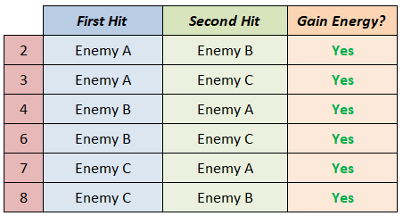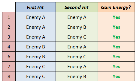 Note that: if we hit Enemy A first, then as long as there’s an enemy to hit the second time around, we are guaranteed to gain extra energy. So we put yes in all cases of “first hit Enemy A”.