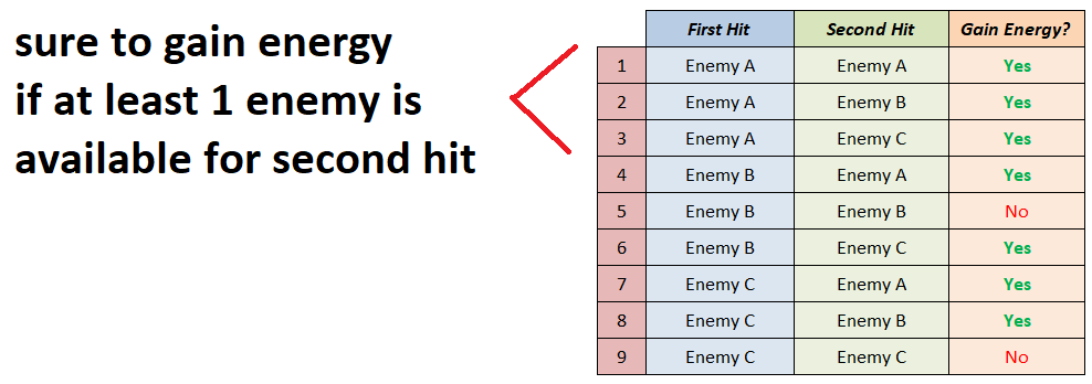 Now, let’s identify which of these outcomes lets us gain 1 extra energy. Note that we gain 1 energy if we hit two different enemies.