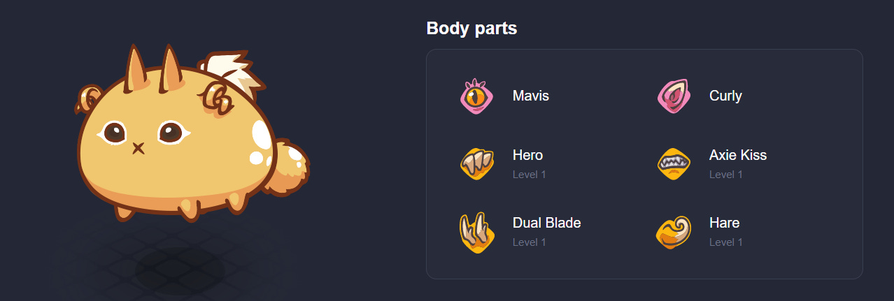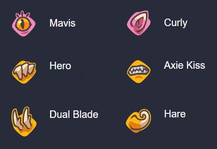 { Mavis, Curly, Hero, Axie Kiss, Dual Blade, Hare }