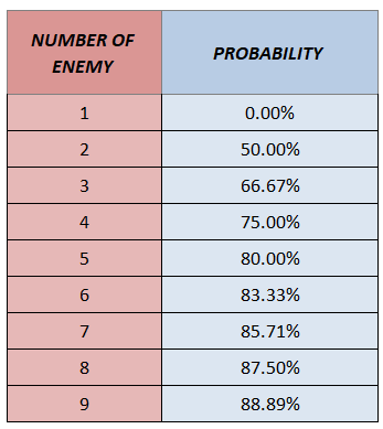 Here we already computed and compiled the complete probabilities from 1 to 9 enemies: