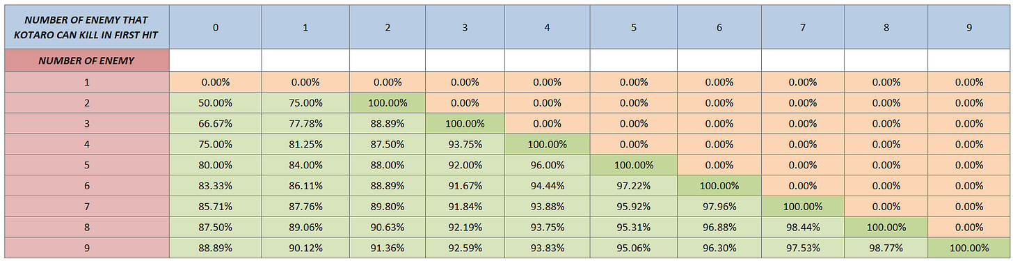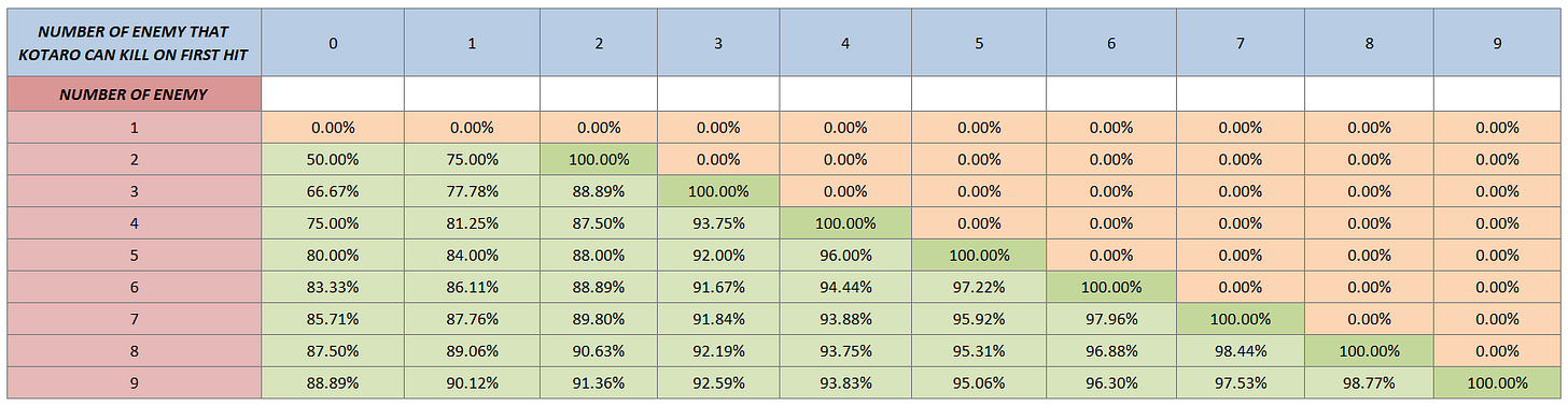 Things will also be different if we have a chance to last hit more than one enemy during the first hit of Kotaro. Here’s a summary of these probabilities: