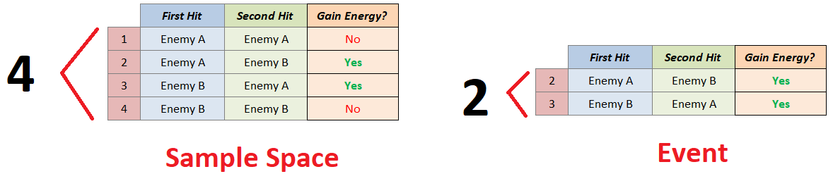 In the Kotaro Case above where we have 2 enemies, our sample space has a total of 4 outcomes and our event has 2 outcomes: